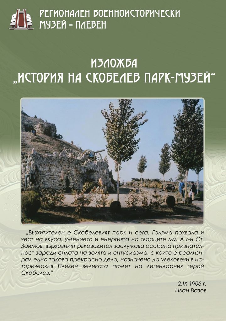 ИзложбиБЛОКАДА И ПОСЛЕДЕН БОЙ ЗА ПЛЕВЕН – 10 ДЕКЕМВРИ 1877 г.25.11.2024 ИзложбиИСТОРИЯ НА СКОБЕЛЕВ ПАРК-МУЗЕЙ08.08.2024 ИзложбиСЪХРАНЕНИТЕ СПОМЕНИ ЗА ВОЙНАТА09.02.2024 ИзложбиГЕРОЙ НА СВОЕТО ВРЕМЕ23.11.2023 ИзложбиВЪЗРОЖДЕНЕЦЪТ ДОСТОЕН ЗА ПЕРОТО НА ДЮМА24.04.2023